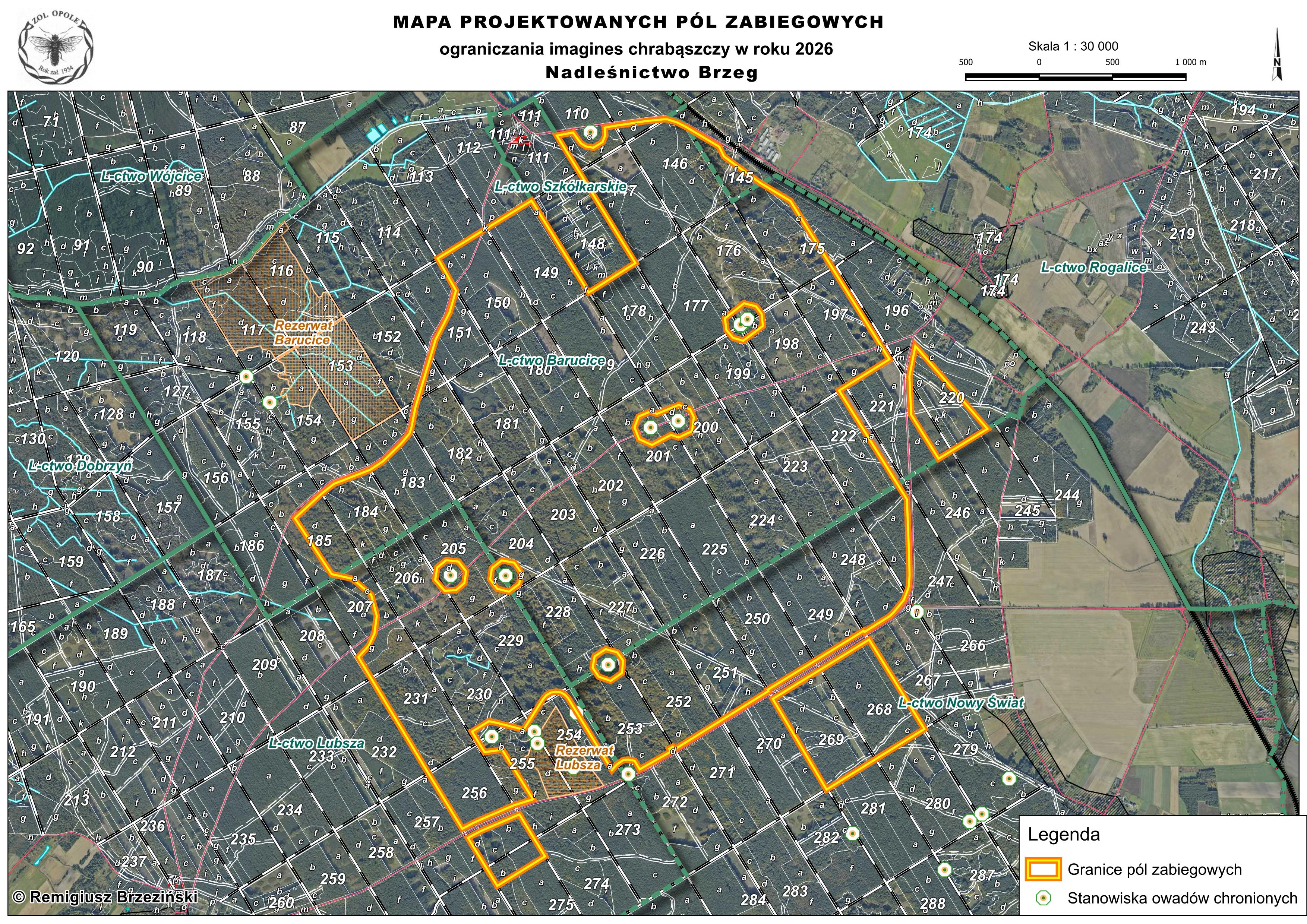 Ograniczanie nadmiernej liczebności imagines (postaci doskonałych) chrabąszczy planowane jest na terenach leśnych będących w zarządzie Nadleśnictwa Brzeg, położonych w Gminie Lubsza o łącznej powierzchni 1262 ha w leśnictwach (Leśnictwie): Barucice – 831 ha, Rogalice – 7 ha, Lubsza – 190 ha i Nowy Świat 234 – ha. Szczegółową lokalizację zabiegów przedstawia mapa w załączeniu.